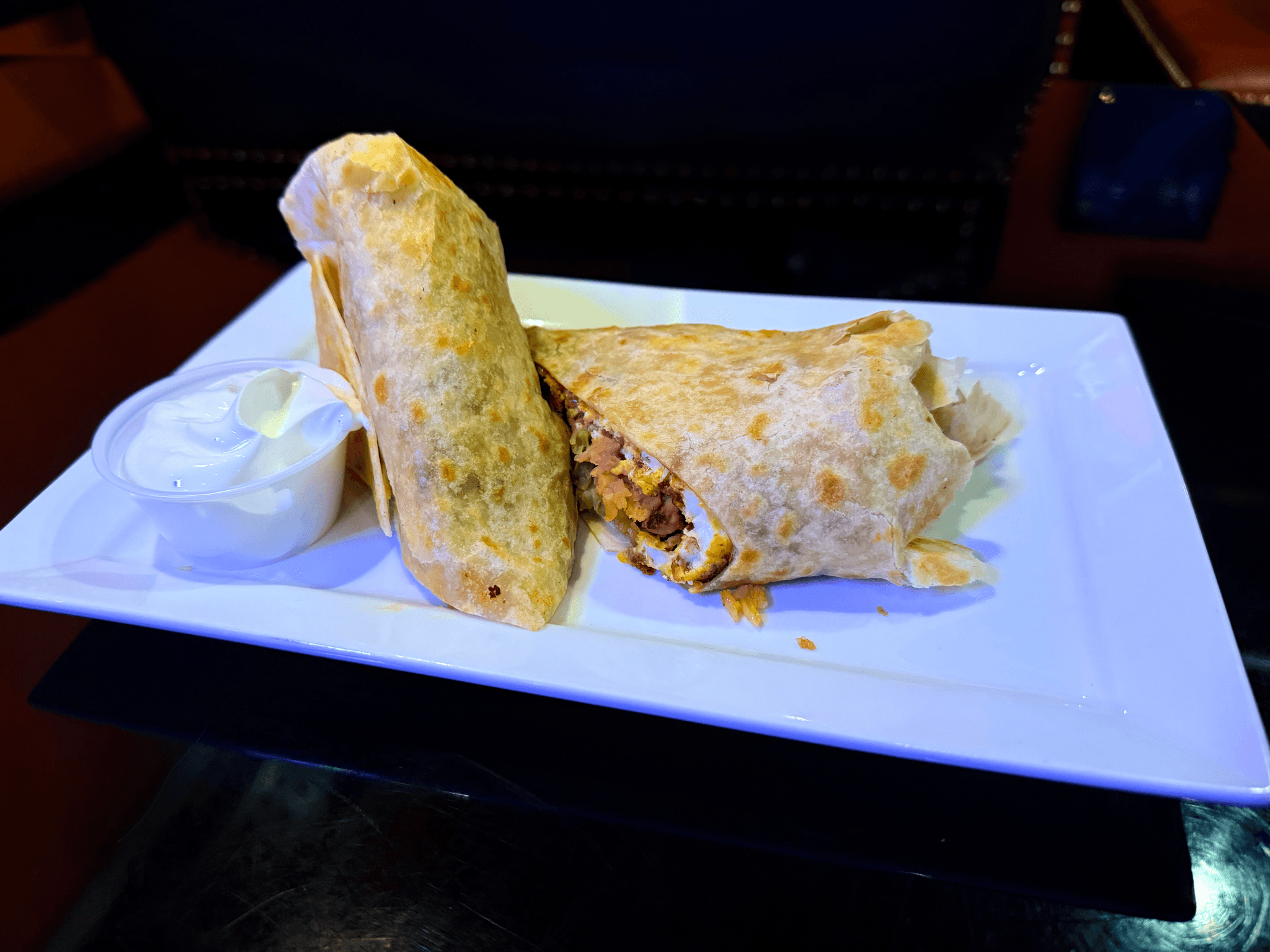Stuffed flour tortilla with grilled chicken or steak, chorizo, Spanish rice, and refried beans then topped with queso dip and pico de gallo