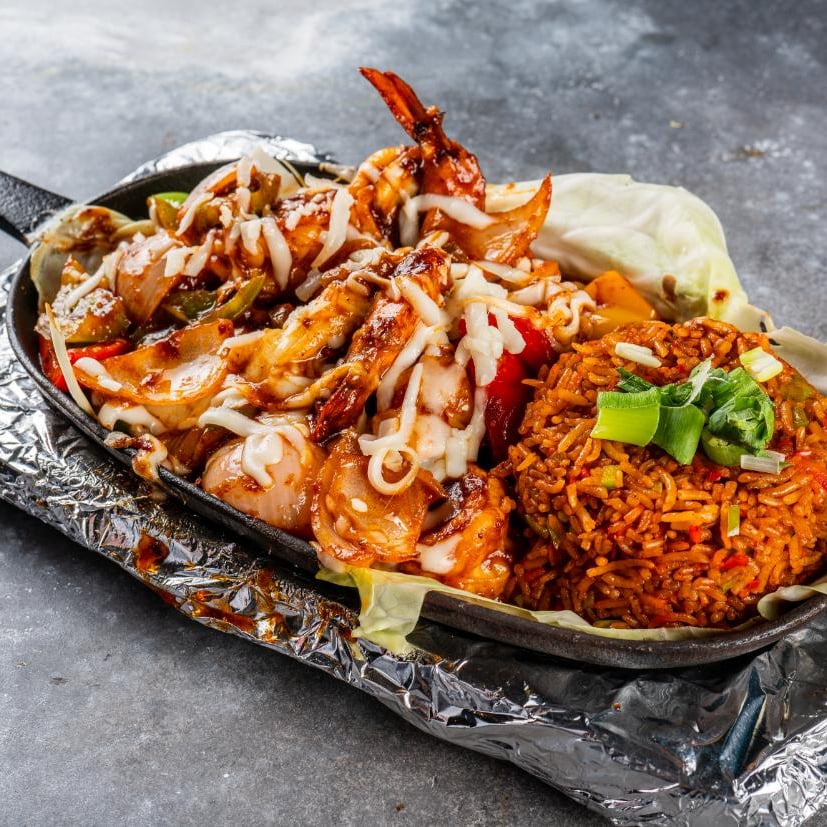 Seasoned grilled chicken, steak, and shrimp with onions and red, yellow, and green peppers. Served on a hot skillet and a salad plate with Spanish rice or refried beans, lettuce, guacamole, sour cream, and corn or flour tortillas