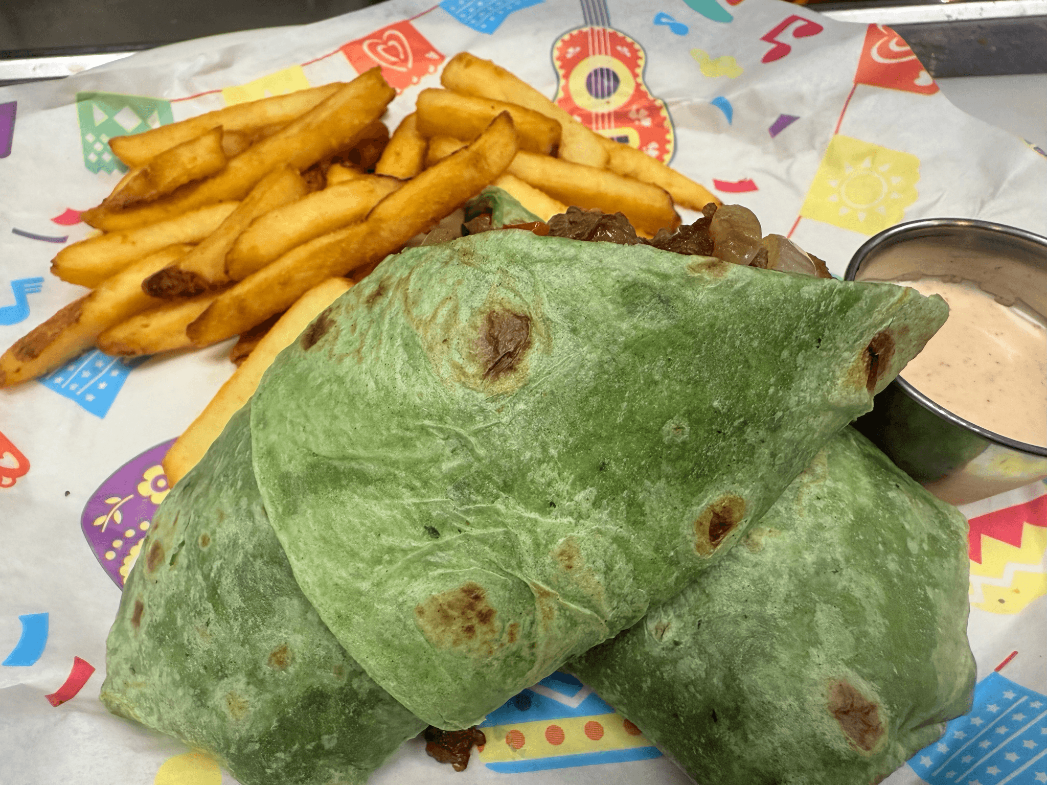 Spinach Tortilla filled with Grilled Colored peppers and Onions your choice of chicken or steak served with French Fries and chipotle Dressing