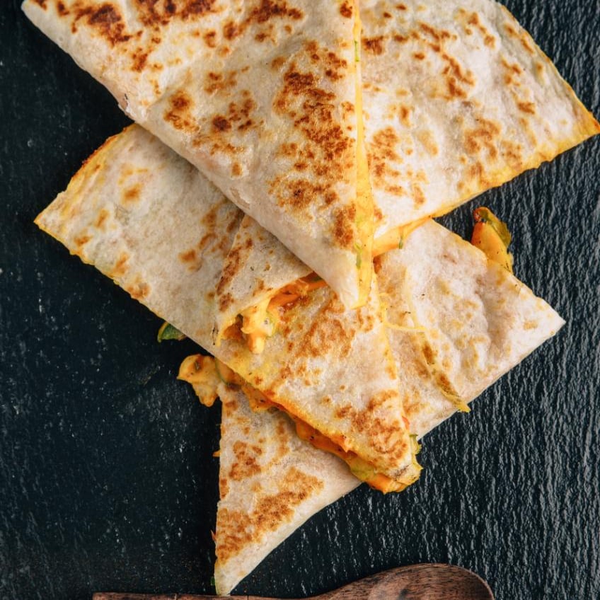 Flour tortilla filled with cheese then garnished with lettuce, sour cream, and sliced tomato